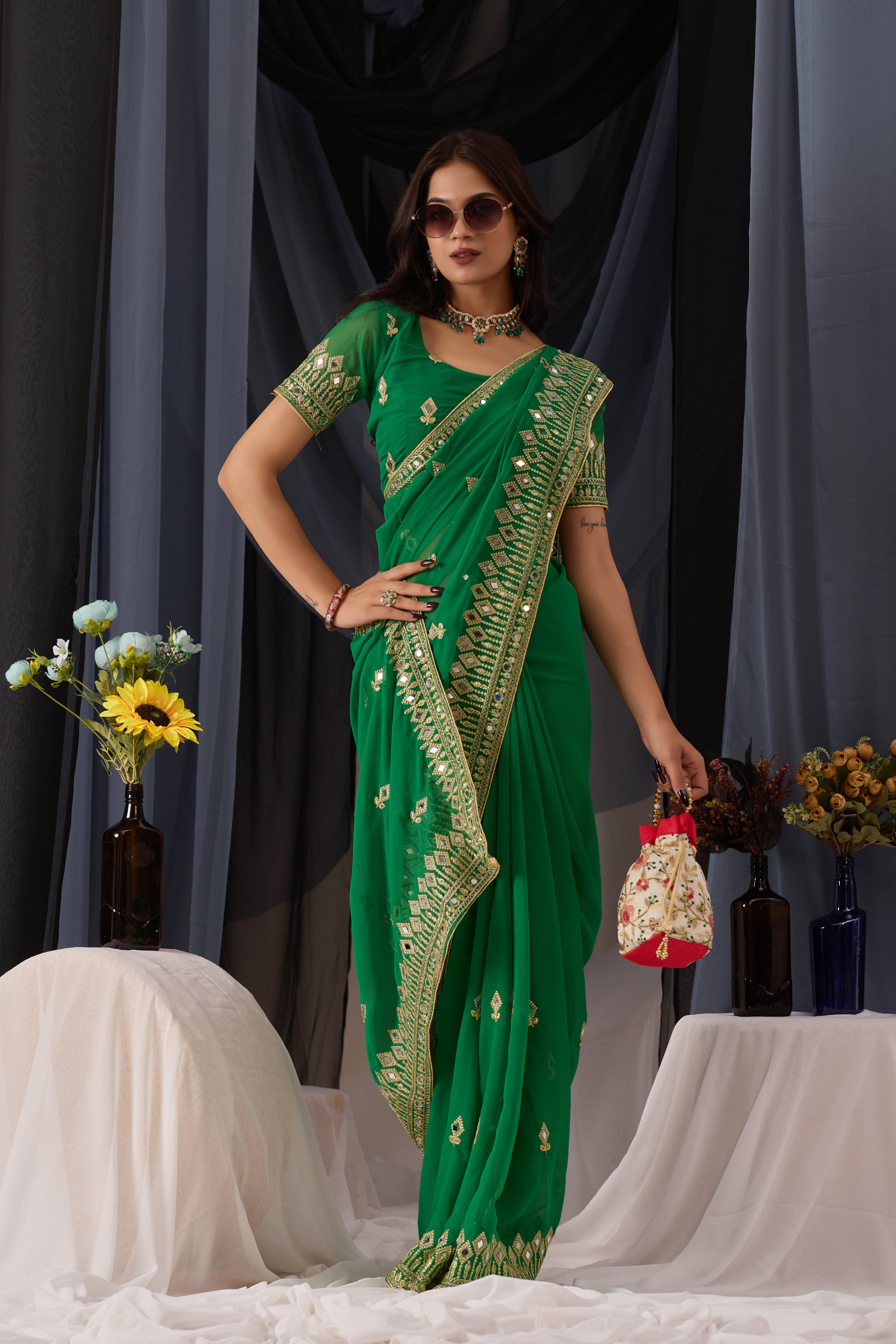 Elegant Green Georgette Saree with Golden Embroidered Border Elegant Green Georgette Saree with Golden Embroidered Border